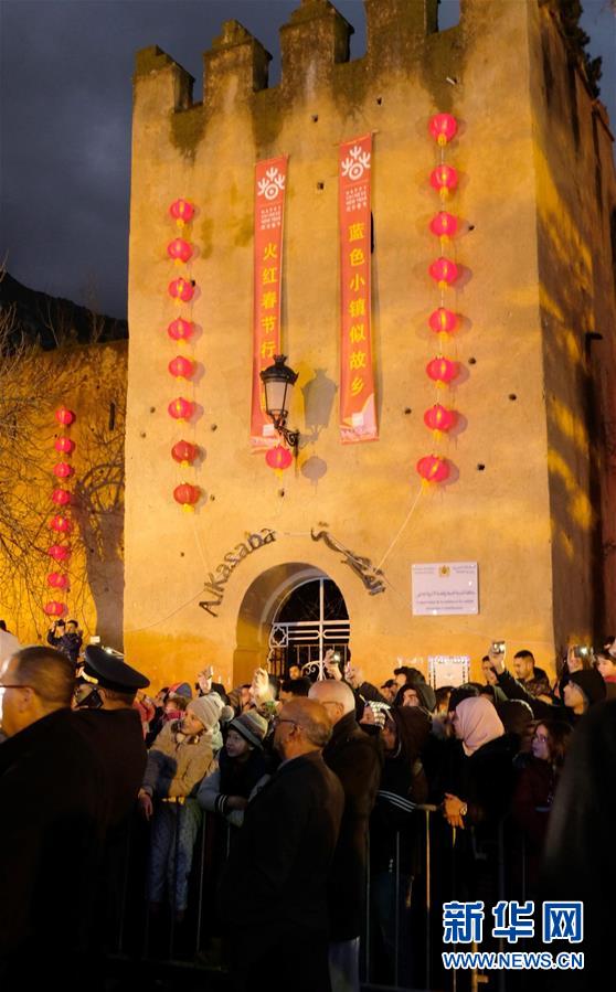 2月1日晚,上千盏中国红灯笼将摩洛哥“蓝色小镇”舍夫沙万的老城装点一新。 新华社记者 陈斌杰 摄