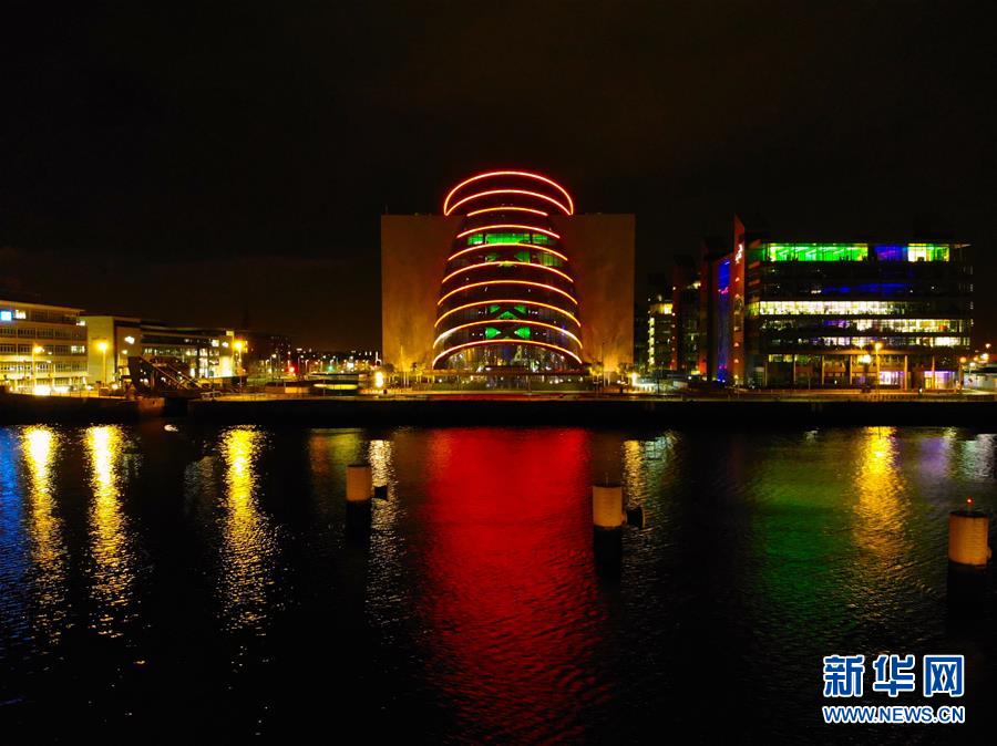 2月3日晚,爱尔兰首都都柏林的都柏林会议中心被“中国红”点亮。 新华社发