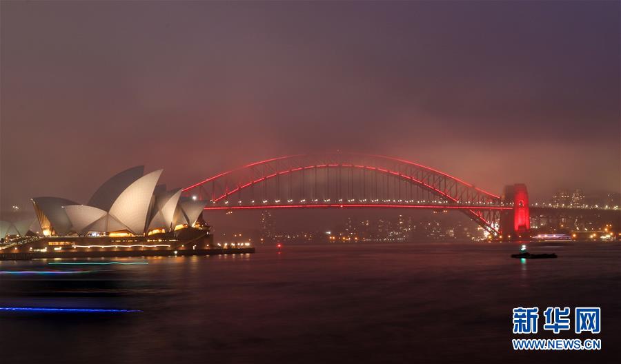 2月1日晚,澳大利亚悉尼海港大桥点亮红色照明,迎接中国农历新年。新华社记者 白雪飞 摄