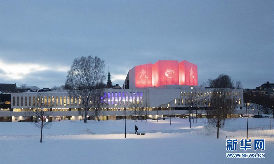 2月4日晚,位于赫尔辛基市中心的芬兰大厦被红色的春节彩灯照亮。  新华社发(马蒂·马蒂凯宁 摄)