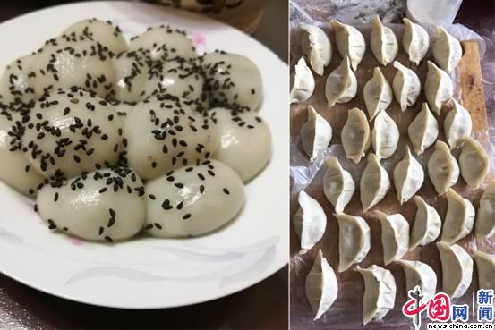 左图为湖南汩罗蔡香玲奶奶家的汤圆,右图为辽宁鞍山张欣彤家自制手工大蒸饺。