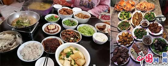 左图为湖南汩罗蔡香玲奶奶家的年夜饭,右图为辽宁鞍山张欣彤家的年夜饭。
