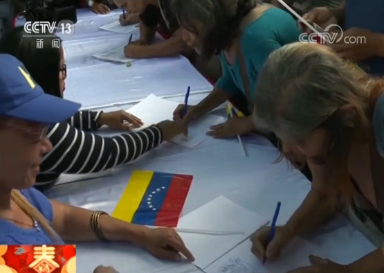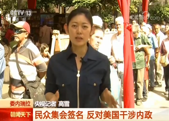 央视记者 高雪: 我现在是在委内瑞拉首都加拉加斯市中心的玻利瓦尔广场,许多民众自发地来到这里,参加集会签名活动,表达对马杜罗政府的支持,反对美国干涉本国内政。
