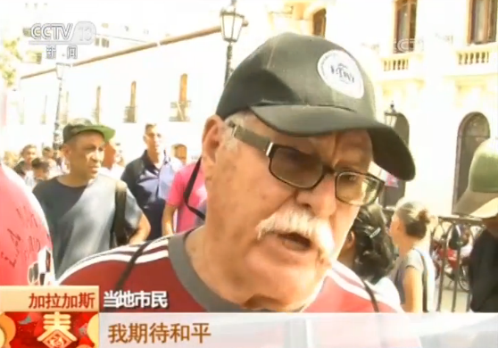 当地市民: 我期待和平,对我们国家来说,和平是第一位的,参加集会是为了支持我们的总统,支持委内瑞拉总统马杜罗。
