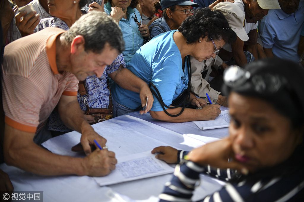 当地时间2019年2月6日,委内瑞拉加拉加斯,鉴于美国近期连续对委内瑞拉政府施加新的制裁和威胁,民众举行集会签名活动,反对外部势力干涉本国内政。在玻利瓦尔广场,许多民众自发地来到这里,参加集会签名活动,表达对马杜罗政府的支持,反对美国干涉本国内政。图片作者:YURI CORTEZ /视觉中国
