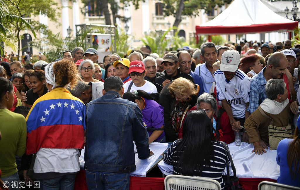 当地时间2019年2月6日,委内瑞拉加拉加斯,鉴于美国近期连续对委内瑞拉政府施加新的制裁和威胁,民众举行集会签名活动,反对外部势力干涉本国内政。在玻利瓦尔广场,许多民众自发地来到这里,参加集会签名活动,表达对马杜罗政府的支持,反对美国干涉本国内政。图片作者:YURI CORTEZ /视觉中国