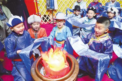 孩子们体验蒙古族小年祭火仪式。 内蒙古博物院供图
