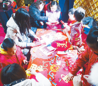 家长与孩子一起制作蒙古族福帖。 内蒙古博物院供图