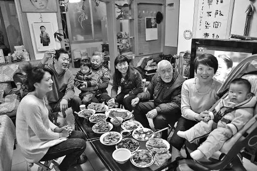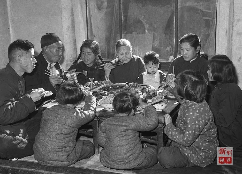 1953年,天津市汉沽区芦台王德铸(左一)一家吃团圆饭。