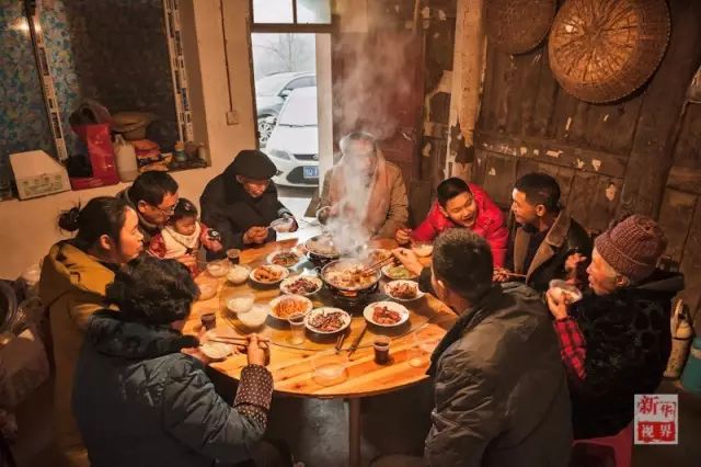 湖北省建始县花坪乡张家槽村的一户家庭围坐一起吃团圆饭。新华社发(周阿寒 摄)
