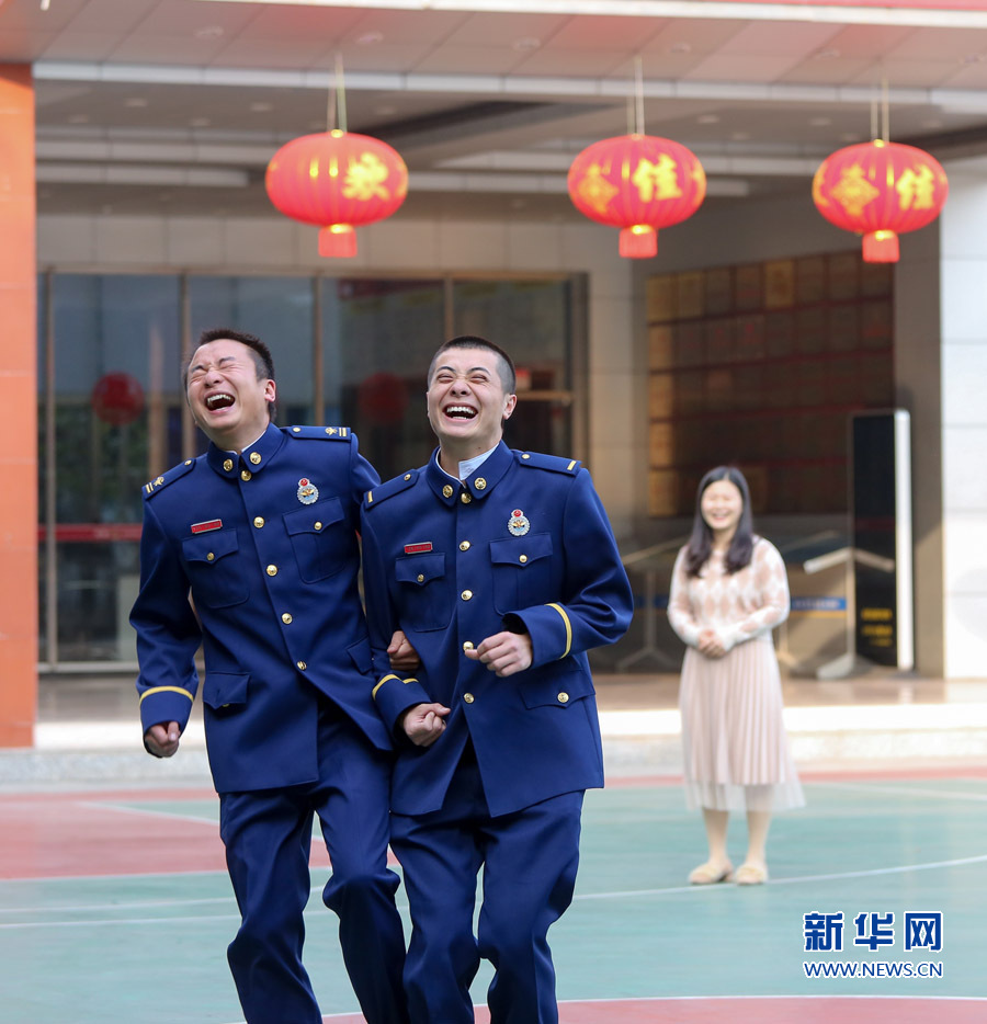 2月6日正月初二,是“走娘家”的日子。消防员林胜坚守岗位,只好挥手目送妻子陈丽凤走出消防站,独自回娘家。新华网 肖和勇 摄