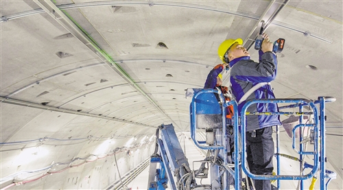 2月8日,苏通GIL综合管廊,工作人员在长江南通段安装灯具支架及传感报警器。春节期间,工程建设者在全球首个特高压环网1000千伏淮上线控制性工程的“咽喉”——苏通GIL综合管廊进行电气设备安装。黄 海摄(中经视觉)