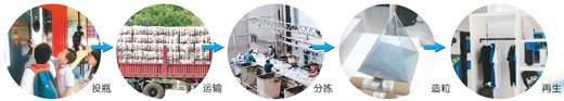 在工厂,这些瓶砖会根据颜色被再次分拣。由于材质不同,标签、瓶盖、瓶身会分开处理。不能再生的标签会被集中处理;瓶盖经过处理加工后,会被做成提手、地垫等;瓶身会被粉碎为瓶片。经过进口生物碱清洗,这些瓶片会被熔融、造粒成为米粒大小、具有同样规格的再生聚酯切片。据了解,盈创再生工厂年处理塑料饮料瓶达5万吨,相当于节约石油30万吨。