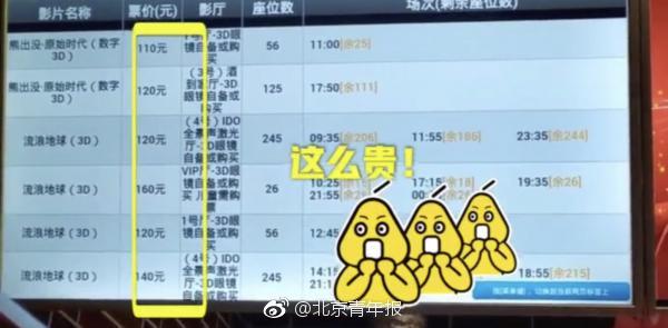 2月11日,有网友发帖称,今年春节期间,河南信阳某影院的黄金时段电影票价超过百元,一张《流浪地球》电影票价格为160元。有网友称该价格“远超平时价格,甚至比一线城市还贵。”对此,当地相关部门解释,电影票价系市场调节价,未接到过群众举报,但消费者可自主选择不同方式观看电影。