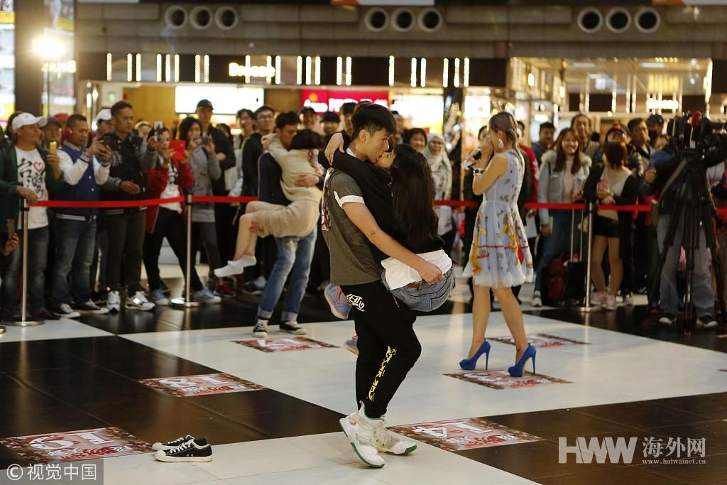 ​2019年2月10日,台北车站大厅内举办接吻大赛,参赛者为赢取手机等奖项各显神通。 陈小愿/中新社/视觉中国