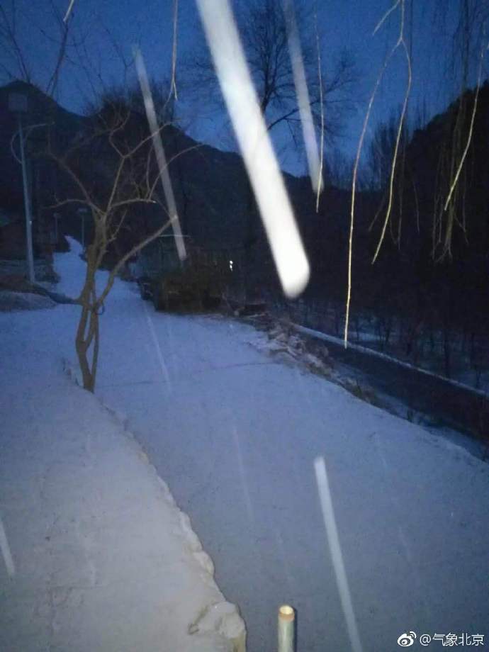 今天早晨,北部郊区率先观测到降雪。其中延庆本站5:36开始出现降雪。山区气温较低,湿度加大,易形成道路结冰,行车务必注意交通安全,外出请注意防寒保暖。 记者注意到,延庆佛爷顶积雪已经很明显。早晨5点,怀柔区宝山镇四道河村开始降小雪。早晨8点,记者在城区南三环附近,也已经看到有雪花开始飘落。