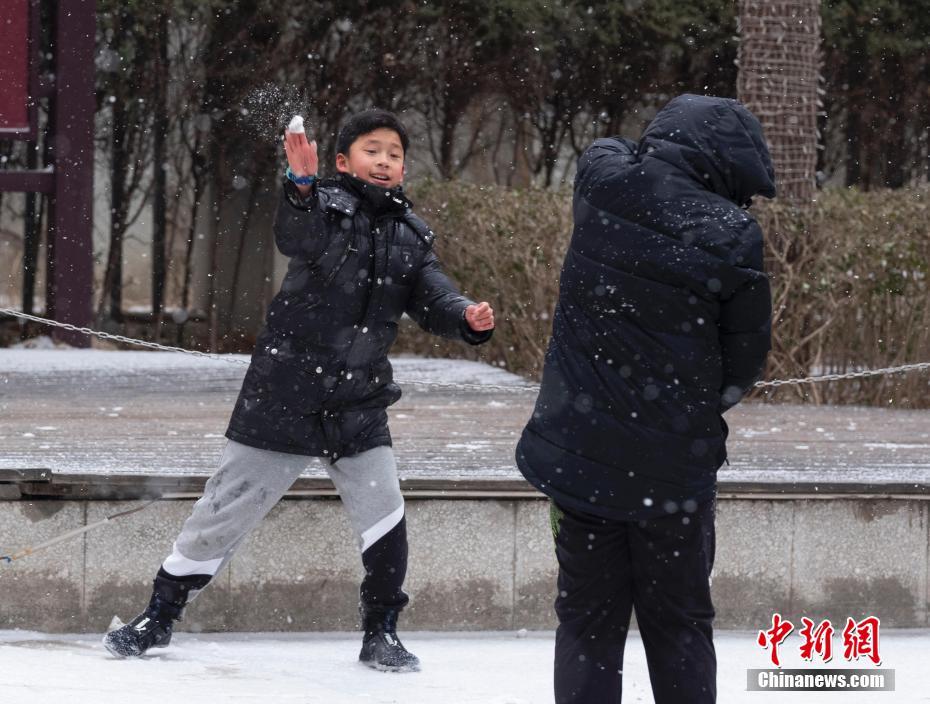 2月12日,小朋友在居民小区里打雪仗。当天,北京城区较大范围降雪。中新社记者 侯宇 摄
