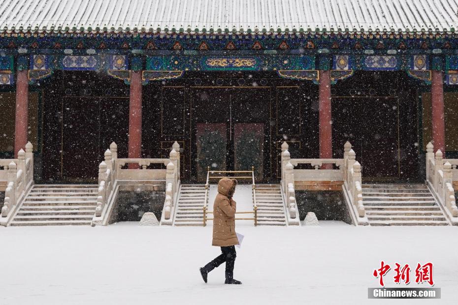 2月12日,北京城区大部分地区出现明显降雪。图为一名工作人员从北京历代帝王庙前走过。中新社记者 崔楠 摄