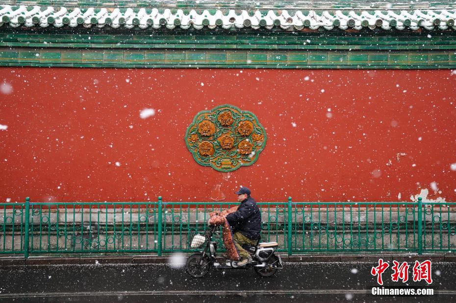2月12日早,北京城区迎来了2018年入冬以来首场大规模降雪。图为一男子骑车经过北京阜成门内大街。中新社记者 崔楠 摄