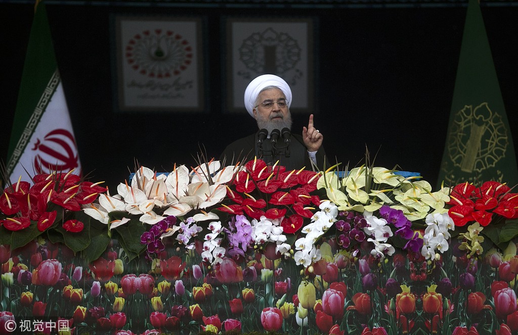 当地时间2019年2月11日,伊朗德黑兰举行集会纪念伊斯兰革命40周年,伊朗总统哈桑·鲁哈尼发表讲话,民众怒烧美国国旗。