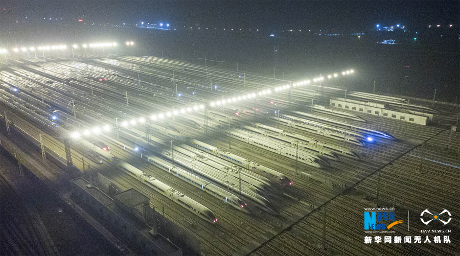 今年春运,每当夜幕降临,百组“复兴号”动车组停靠在广州动车段各运用所上,整装待发,宛如“陆地舰队”。新华网发(宋兴华 摄)