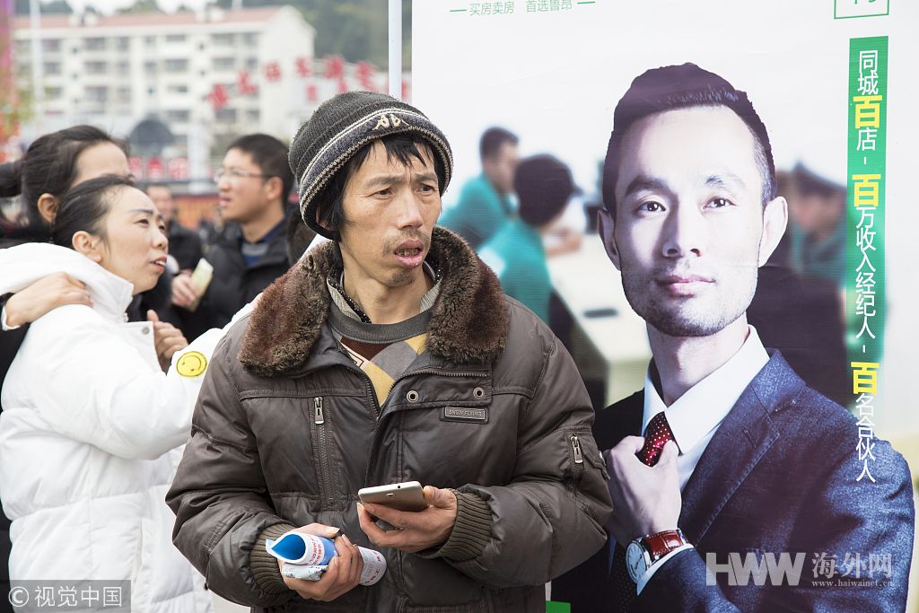 2019年2月12日,四川遂宁,2019年春风行动暨服务农民工大型招聘会举行,一求职者在招聘广告前的等待。