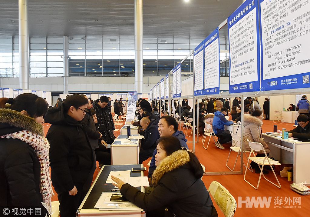 2019年2月12日,在江苏扬州新春大型综合类人才招聘会上,求职人员细心寻求适合自己的工作岗位。