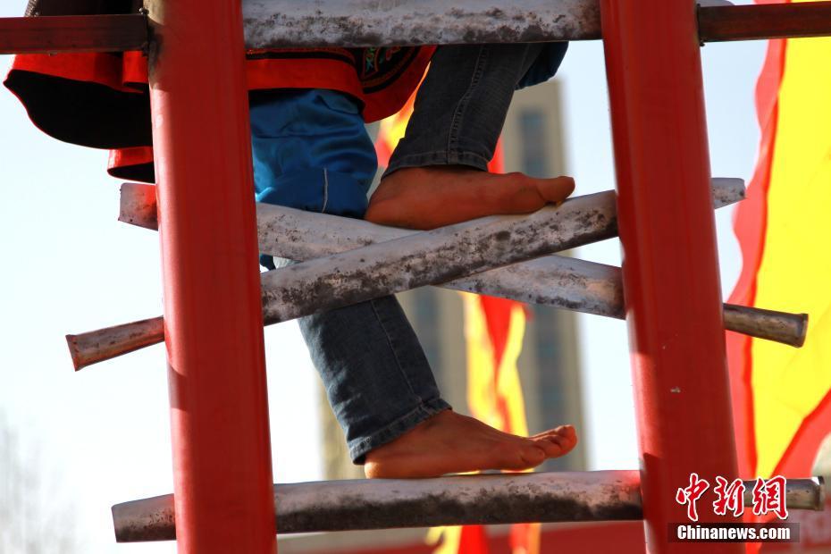 2月12日,青海省民和回族土族自治县举行“刀山会”祈福新年。此次时隔74年的“上刀山”盛会,既是对新年的祈福活动,也是对古老文化的传承。中新社记者 李培源 摄