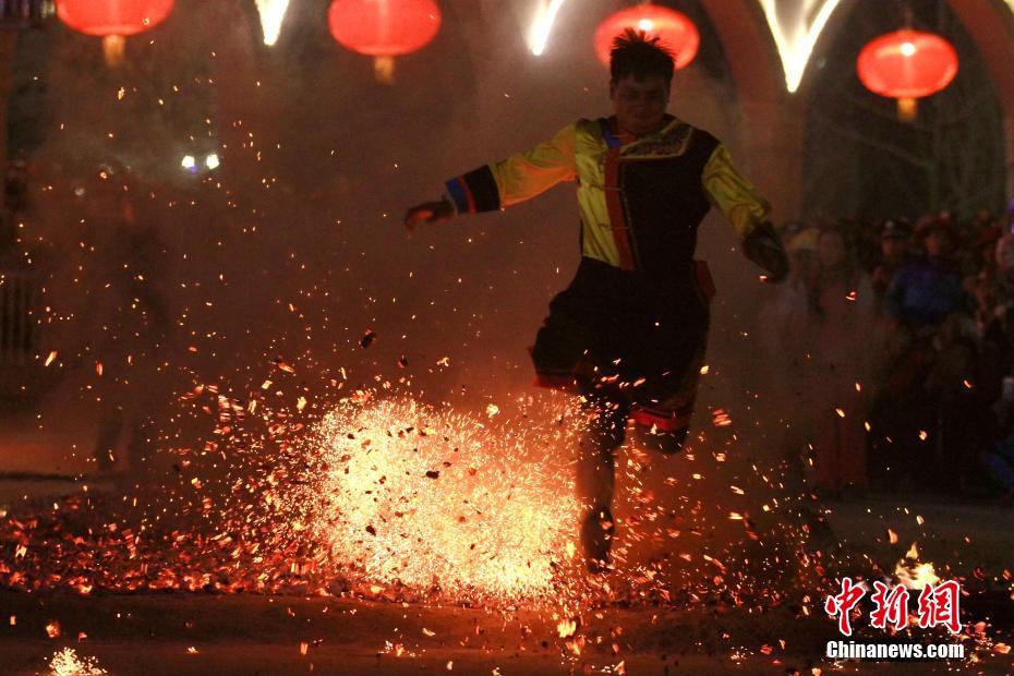 2月12日,青海省民和回族土族自治县举行传统的“下火海”表演,红红火火过春节。图为表演者赤脚跑过火炭。中新社记者 李培源 摄