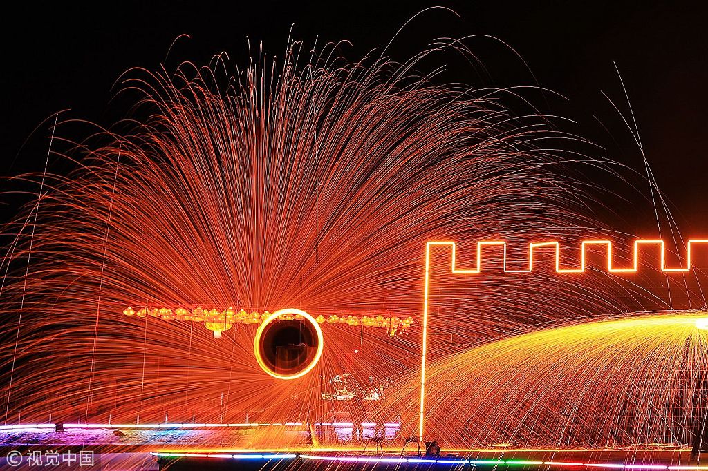 2019年2月13日,北京,世界公园非遗打铁花“穿越时空”,迸耀出灿烂的火花。四大演艺章节交相辉映。大地之光:熔炼先古传奇;千年之光:迸射历史风采;传承之光:闪耀时代脉搏、民族之光:传送中华之魂。古老的技艺,凝聚着精神与力量,匠心与智慧的正能量。铁花火龙舞,火树银花秀、星河月亮船,梦幻出“忽如一夜春风来,千树万树梨花开”的神奇美景。