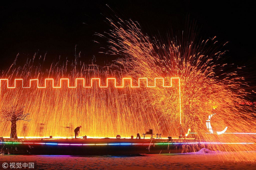 2019年2月13日,北京,世界公园非遗打铁花“穿越时空”,迸耀出灿烂的火花。四大演艺章节交相辉映。大地之光:熔炼先古传奇;千年之光:迸射历史风采;传承之光:闪耀时代脉搏、民族之光:传送中华之魂。古老的技艺,凝聚着精神与力量,匠心与智慧的正能量。铁花火龙舞,火树银花秀、星河月亮船,梦幻出“忽如一夜春风来,千树万树梨花开”的神奇美景。