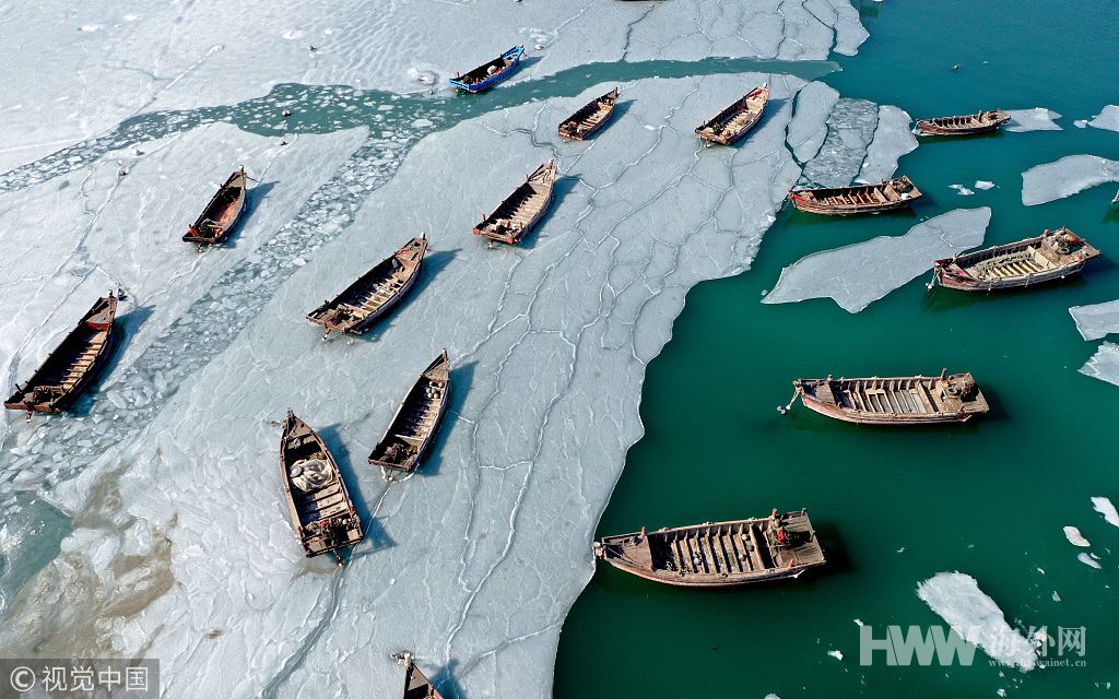 2019年2月14日,大连市金石滩渔港海冰逐渐融化,被海冰冻住的大批渔船得以解困,渔民们驾驶船只在融化的海冰间破冰穿行,开始海上作业生产,收割运输裙带菜等海珍品。