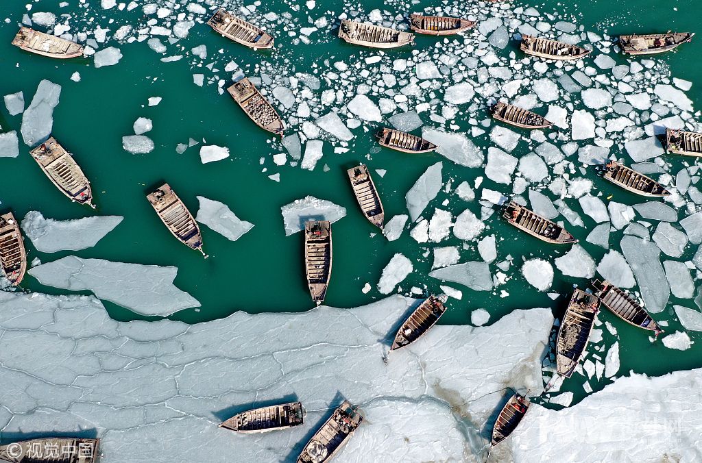 2019年2月14日,大连市金石滩渔港海冰逐渐融化,被海冰冻住的大批渔船得以解困,渔民们驾驶船只在融化的海冰间破冰穿行,开始海上作业生产,收割运输裙带菜等海珍品。