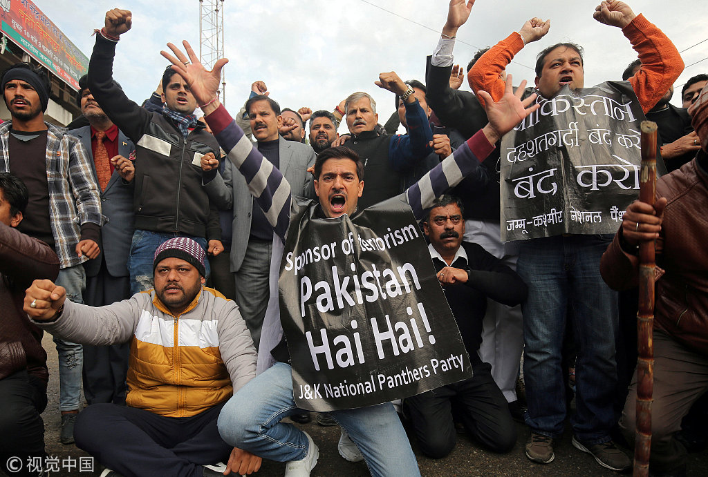当地时间2019年2月15日,印控克什米尔查谟,民众示威抗议中央后备警察部队大巴遇袭事件。14日,印控克什米尔地区发生攻击事件,一名自杀炸弹客驾驶汽车,冲撞印度中央后备警察部队乘载的大巴士,造成车上44人丧命。
