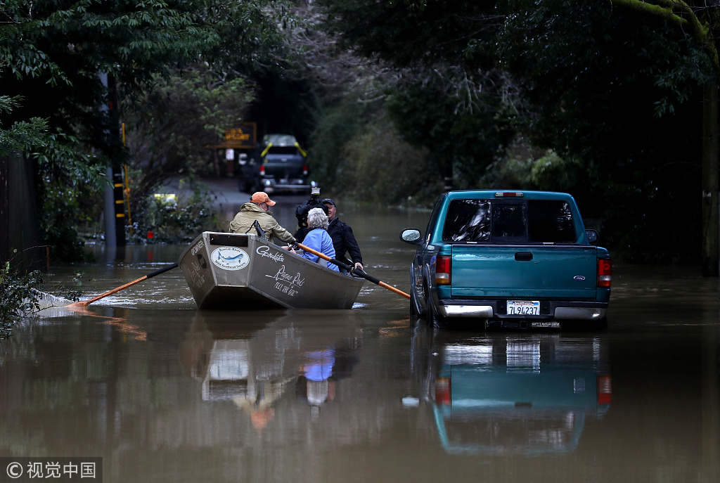 美国加州遭暴雨袭击 民众划艇撤离