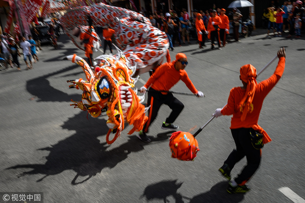 当地时间2019年2月17日,印度尼西亚山口洋,当地舞龙庆祝元宵节。