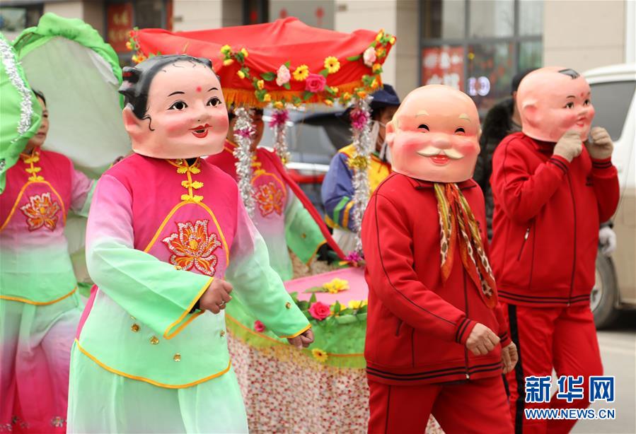 2月17日,江苏丰县中阳里街道古丰社区居民在进行民俗表演。元宵节临近,各地举办丰富多彩的民俗活动,欢欢喜喜迎佳节。 新华社发(高荣光 摄)