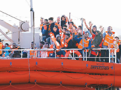 图为2018年6月27日,在马耳他森格莱阿锅炉码头,难民们准备走下救援船“生命线”号。 新华社/路透