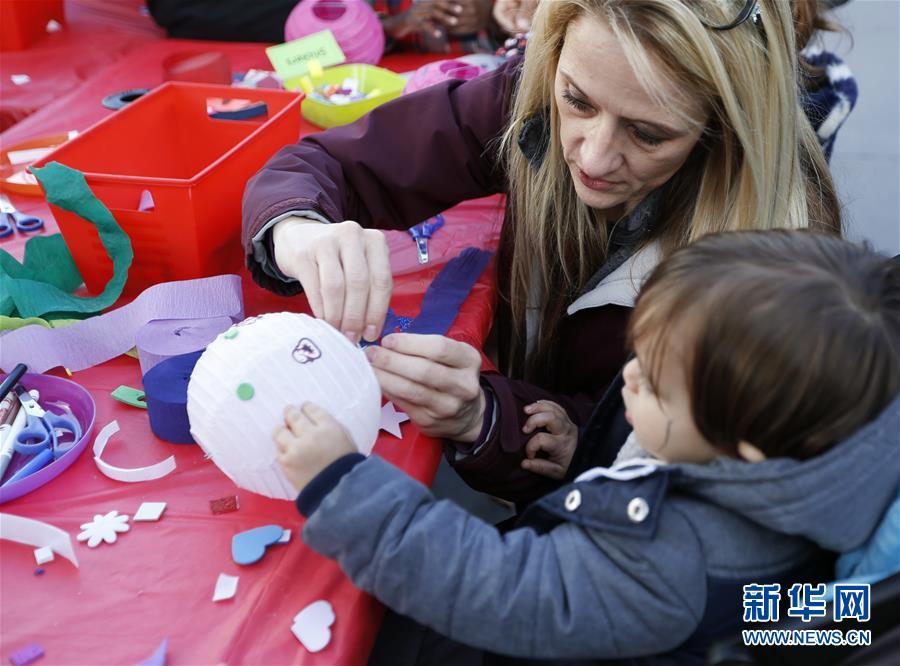 2月17日,在美国洛杉矶农夫市场,一位母亲和孩子一起做灯笼。新华社记者李颖摄