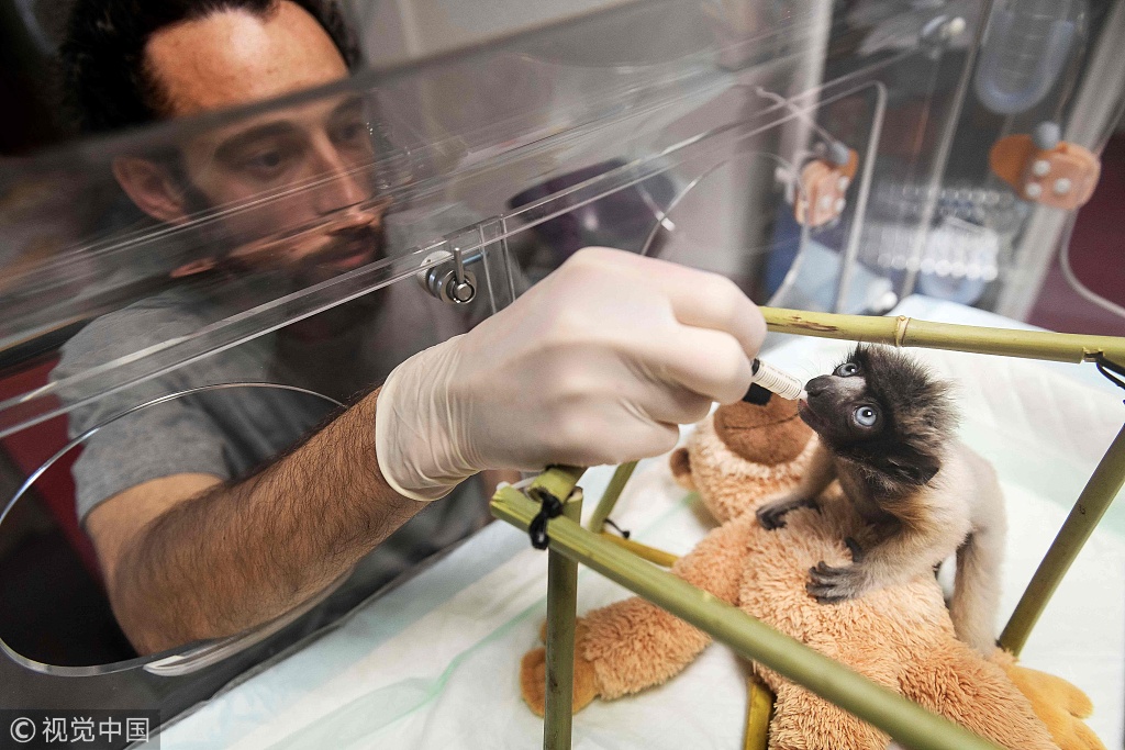 当地时间2019年2月18日,法国贝桑松,贝桑松动物园的兽医正在给一只名叫“Soa”的雌性冠冕狐猴喂食。冠冕狐猴是马达加斯加的一种极度濒危物种。