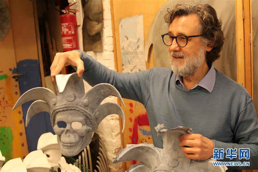2月16日,在意大利威尼斯,卡马卡纳面具工坊创始人马里奥·贝洛尼向客人介绍威尼斯面具的制作工艺。 新华社发(黄万晴 摄)