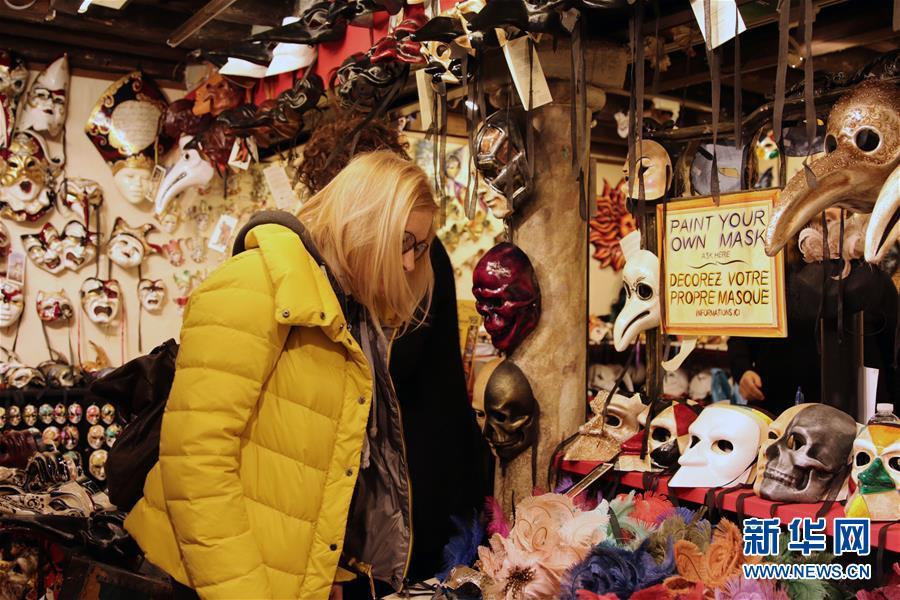 2月16日,在意大利威尼斯,一位顾客挑选面具。 新华社发(黄万晴 摄)