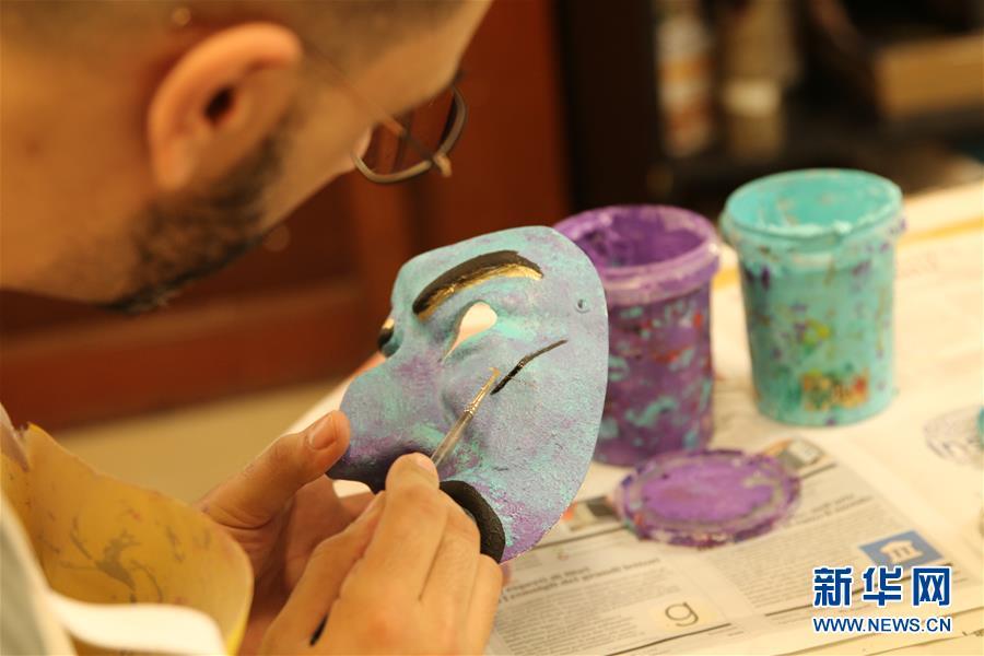 2月16日,在意大利威尼斯,一位游客在面具工坊绘制自己的威尼斯面具。 新华社发(黄万晴 摄)