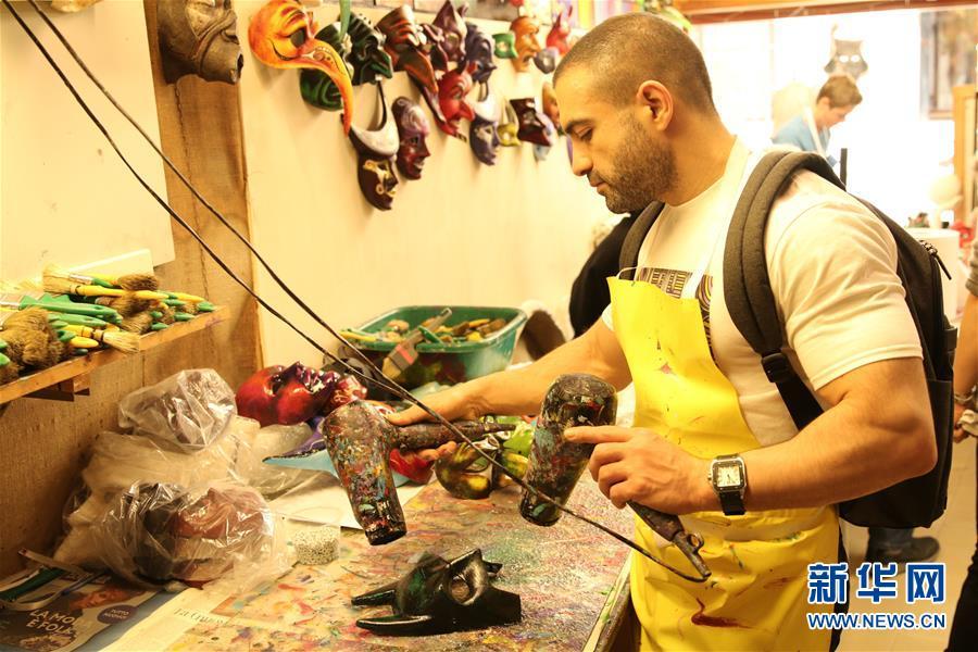 2月16日,在意大利威尼斯,一位游客吹干自己刚上完色的威尼斯面具。 一年一度的威尼斯狂欢节正在意大利北部水城威尼斯举行,大街小巷挤满了着华丽服饰、戴精美面具的狂欢者,人们尽情享受节日的欢乐气氛。面具是威尼斯狂欢节的最大特色,也最令游客感兴趣。 新华社发(黄万晴 摄)
