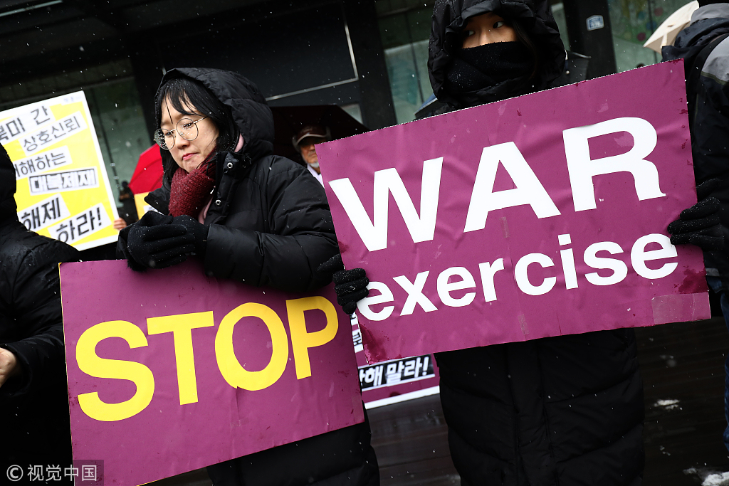 当地时间2019年2月19日,韩国首尔,抗议者在美国大使馆附近参加集会,反对韩美联合军事演习。