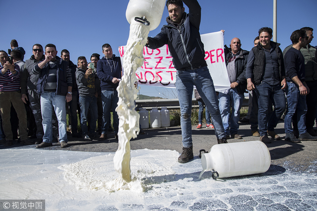 当地时间2019年2月17日,意大利恩纳省,牛奶生产商倾倒2000多升牛奶表示抗议牛奶价格过低。
