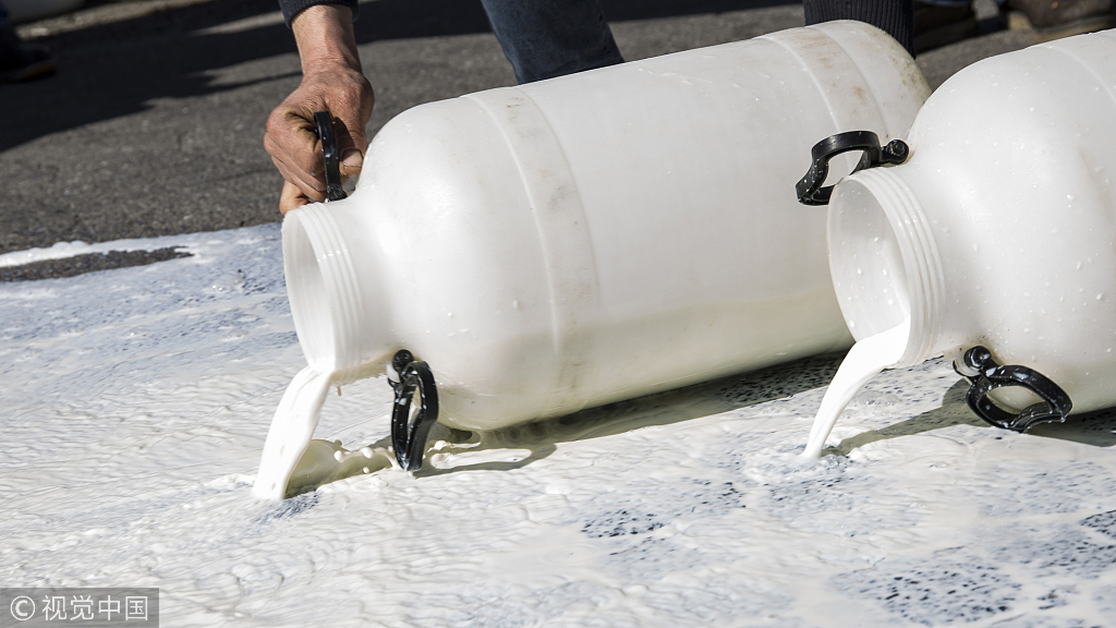 当地时间2019年2月17日,意大利恩纳省,牛奶生产商倾倒2000多升牛奶表示抗议牛奶价格过低。