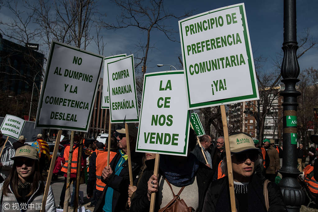 当地时间2019年2月19日,西班牙马德里,农民在街头免费分发柠檬、柑橘等,要求农业政策改革。