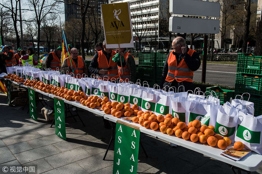 当地时间2019年2月19日,西班牙马德里,农民在街头免费分发柠檬、柑橘等,要求农业政策改革。