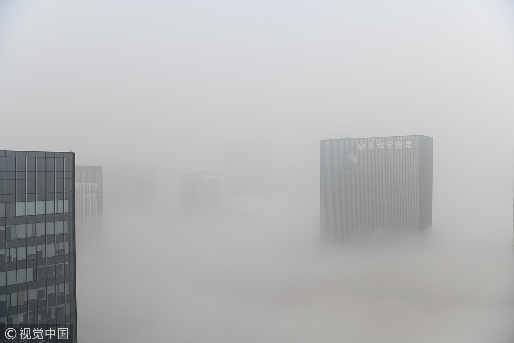 郑州出现平流雾天气 写字楼穿云犹如仙境